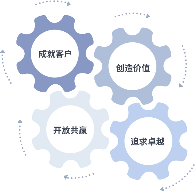成就客户是一切决策的出发点,创造价值是衡量所有工作的标准,追求卓越是币游国际做事做人的态度,开放共赢是币游国际的格局也是最终的结果。价值观的齿轮环环相扣,推动着组织里的每个人不断向前。